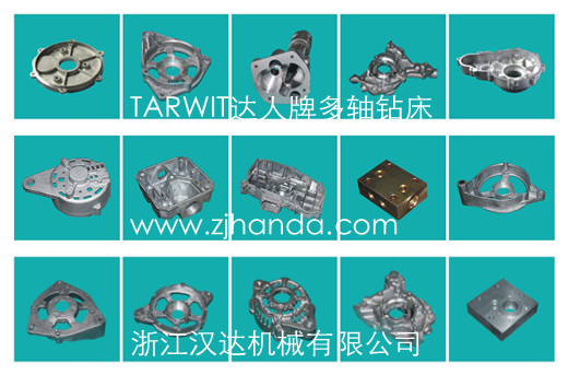 該產(chǎn)品可廣泛應(yīng)用于機械行業(yè)多孔零部件的鉆孔及攻絲加工,如汽車、摩托車多孔零部件、發(fā)動機箱體、鋁鑄件殼體、制動鼓、剎車盤、轉(zhuǎn)向器、輪轂、差速殼、軸頭、半軸等,泵類、閥類、液壓元件、太陽能配件等等。比如以下工件: